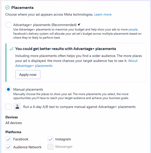 Switching to manual placements gives you the power to choose where your ads are shown—whether it’s Facebook’s News Feed, Instagram Stories, or Messenger ads.